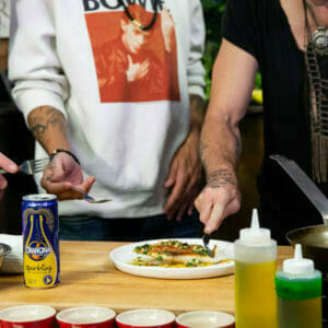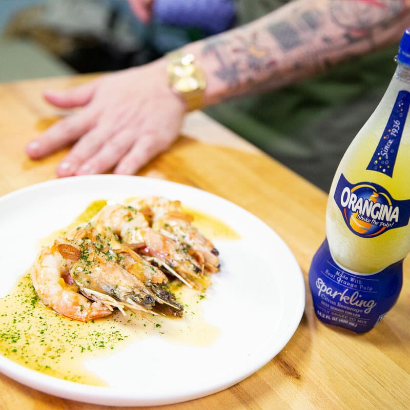 Sauté the cleaned seasoned (salt) shrimp till they are cooked enough to be translucent in the middle. Remove from the pan. Add in chopped garlic and 1 teaspoon of olive oil. Reduce heat too low. Cook the garlic till it is soft and tender. Add parsley into the pan, then add Orangina. Essentially this is going to be the sauce that will be poured over the shrimp on the plate. Once the sauce is fully incorporated gently pour over the shrimp. Garnish with fried garlic.