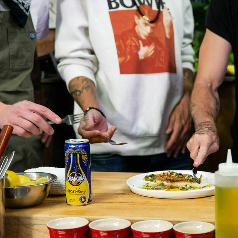 In a mixing bowl combine chopped parsley, zest and juice of 1 lemon, extra virgin olive oil and salt until you reach a paste-like texture. Then add a splash or Orangina.