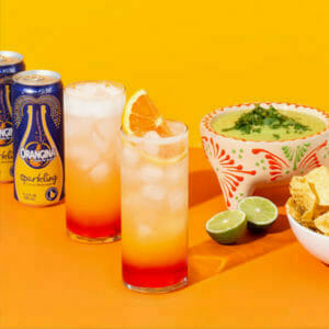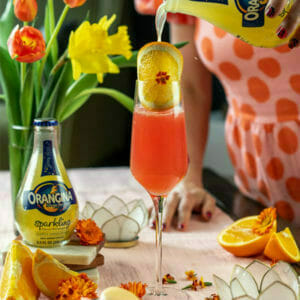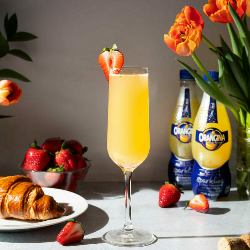 Add chilled syrup and Orangina to a champagne flute. Top with chilled champagne and garnish with a strawberry.